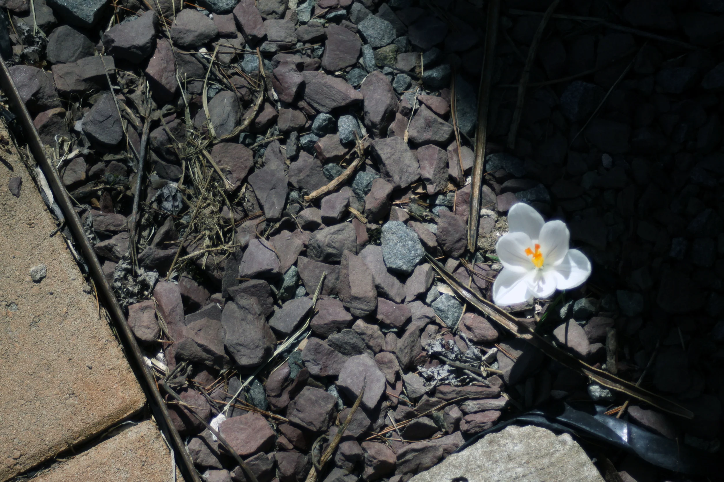 This little Crocus tore through black plastic and heavy gravel stone to emerge. Don't hold back friend, the sun is shining for YOU!